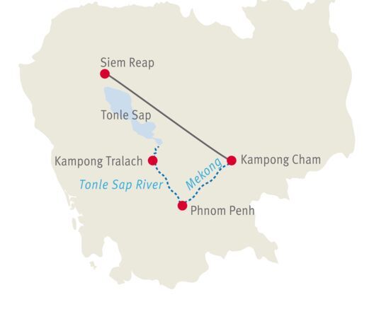 Vers la fin de la saison des pluies, de fin août à mi-novembre environ, le lac Tonle Sap atteint son niveau d'eau le plus élevé. Cela permet de naviguer sur toute sa longueur et votre croisière fluviale commence directement à Siem Reap, puis fait le chemin inverse jusqu'à Kampong Cham et se termine également à Phnom Penh.