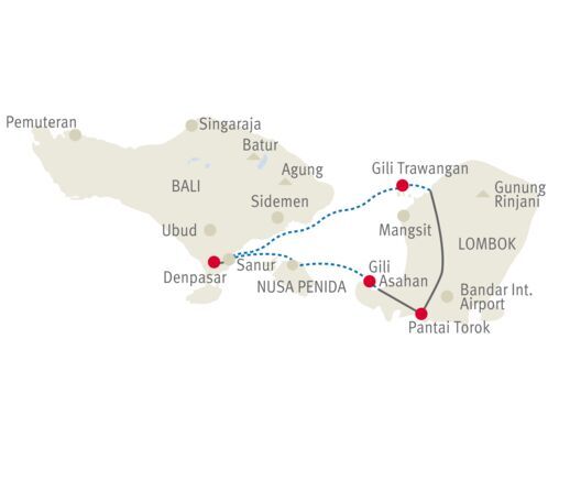 Ce voyage relie trois mondes insulaires qui ne pourraient guère être plus différents et qui, justement pour cette raison, s'harmonisent parfaitement. Sur Gili Asahan, vous profiterez de journées de détente loin du tourisme de masse. Lombok surprend par sa diversité verte, ses villages traditionnels et ses vues spectaculaires, avant que Gili Trawangan n'invite à terminer par une atmosphère de plage animée, des aventures de snorkeling et des couchers de soleil.