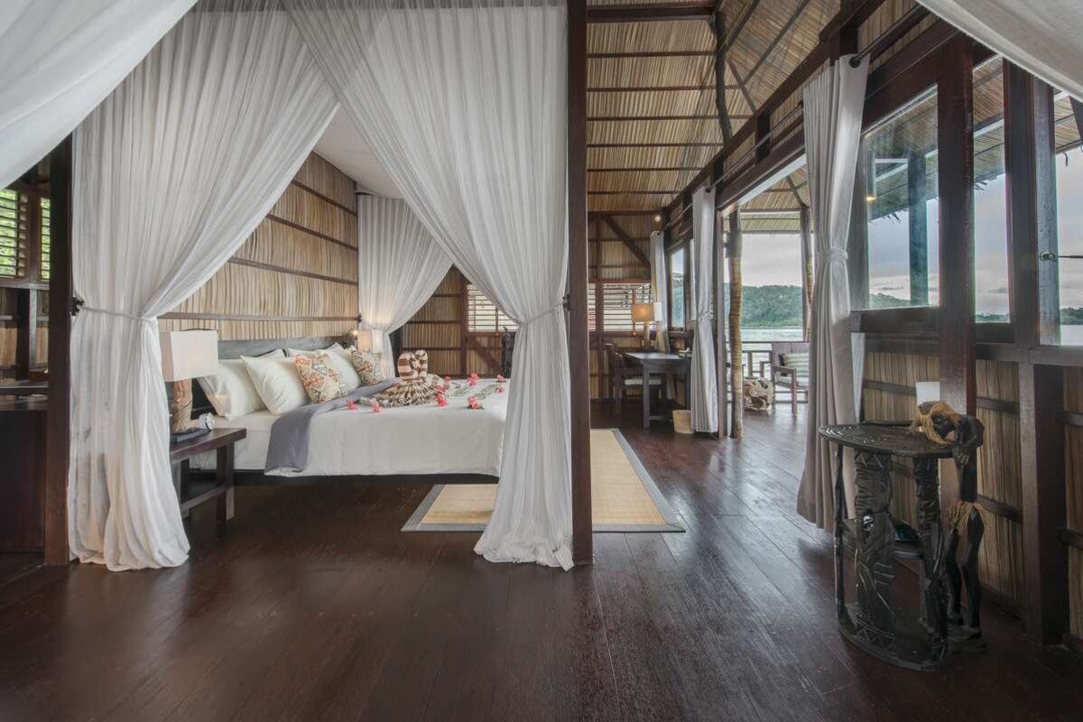 Les 26 bungalows sont construits en style local sur pilotis entre la jungle et le récif le long de la ligne côtière et offrent ainsi une vue magnifique sur la mer. Superior (70m²), équipés de moustiquaires et d'un ventilateur ainsi que d'une grande véranda avec chaises longues et hamacs, offrent une vue directe sur le récif. Deluxe sont plus spacieuses avec un salon, une salle de bain semi-ouverte et un lit de jour sur la terrasse.