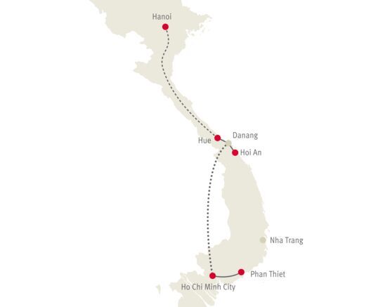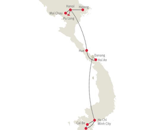 4000 ans d'histoire et de fortes influences culturelles dvenues de Chine, d'Inde et de France ont marqué ce pays fascinant. Les paysages sont aussi colorés que la mosaïque culturelle: les rizières d'un vert éclatant sont tout aussi fascinantes que les régions montagneuses accidentées, le fantastique paysage karstique de la baie d’Halong, le dédale de cours d'eau dans le delta du Mékong et, enfin et surtout, les plages de rêve presque infinies et les côtes intactes. Les voyages au Vietnam sont riches en découvertes et en attractions exotiques. De simples villages de pêcheurs, des lanternes de soie, des tribus de montagne aux coutumes colorées et des chapeaux en cône dans les rizières alternent avec des villes cosmopolites, de magnifiques pagodes et une scène artistique en plein essor. Huit inscriptions au patrimoine mondial de l'Unesco témoignent de grandes réalisations culturelles et de phénomènes naturels. Le pays de «l’envol du dragon» est dans une phase de profond changement. Dans le champ de tensions entre une histoire douloureuse et une croyance inébranlable en un avenir meilleur, on perçoit la grande paix et la force du peuple. Un voyage au Vietnam laisse des impressions durables et des souvenirs inoubliables.