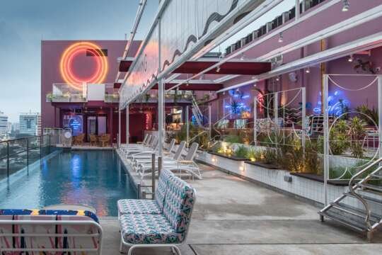 Einladende Lounge-Sofas, zwei trendige Restaurants, Bar, Schwimmbad mit Aussicht und Mini-Gym.