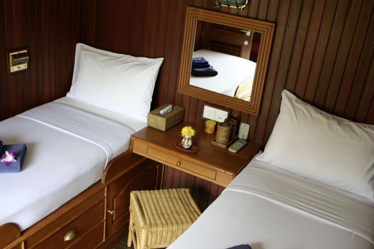 Die «RV River Kwai» •••• ist Thailands erstes Fluss-Kreuzfahrtschiff, ein im Kolonialstil erbauter Flusskreuzer. Die 10 komfortablen, klimatisierten und mit edlem burmesischem Teakholz ausgestatteten Kabinen auf dem Mitteldeck können maximal 20 Passagiere beherbergen. Jede Kabine hat durch eine Glasschiebetüre Aussensicht. Alle Kabinen verfügen über 2 Betten und ein privates Bad/WC mit separater Duschkabine.